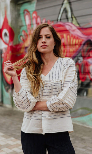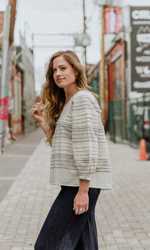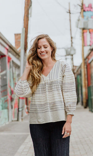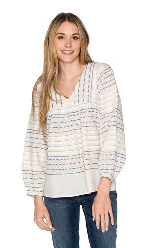 A stylish boho top the Piper Paros Embroidered Peasant Top by designer Velvet by Graham & Spencer is effortlessly distinctive. The top features a peasant style body with contrasting blue stitching and pintuck pleats that sets this top apart. The Piper features a v neck along with 3/4 length sleeves and the body of the top hits below the hips. Available in Multi with off white body and blue stitching. Fabric is 100% Cotton. Machine wash cold, tumble dry low. Made in India.