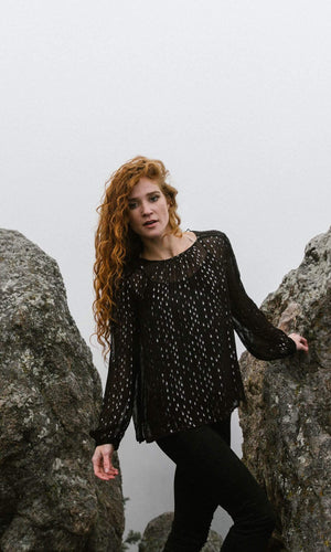This abstract print of black with a silver metallic design will earn its keep in your fashionable wardrobe.  The printed chiffon blouse by Velvet by Graham and Spencer is lined with a black cami.  The body of the top features a sheer chiffon with contrasting silver metallic contrast.   This softly falling fabric has long sleeves that are sheer and features a keyhole opening to the back neckline. The Roma promises effortless elegance that can create a chic standout look.  Fabric is 100% Viscose, lining is 100% Viscose,  Dry clean shirt, hand wash cami.  Made in India.