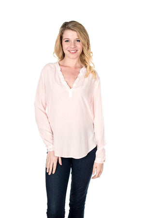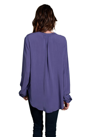 The Rosie Long Sleeve Blouse by Velvet by Graham and Spencer features a henley style collar and long sleeves. The top features a rounded hem and long length hitting below the hips. The top features an oversized, loose style by design. The cuffs of the the sleeves features a button closure. There is also light pleating in the top center of the top in the back and slight pleats around the neckline in front. This top is very versatile and can be dressed up or down. It pairs well with leggings and boots or dressed up with a cute pencil skirt and blazer. Available in Cavalry (Light Teal), Black, Postman (Navy), Allure (Light Pink), Boysenberry (Purple), Chimney (Charcoal Grey). Fabric is 100% Rayon. Machine wash cold, tumble dry low. Made in USA.