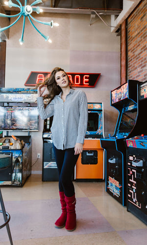 Velvet by Graham and Spencer Rufina Cotton Poplin Top is your traditional button up, but with a long length that hits below the hips really a tunic length and with a wide slit at the waist so it isn't restrictive at the hips. The cuffs have a double button closure and look great rolled up giving you added versatility with the top. Part of this season's checkered pattern resurgence. Available in Navy. Fabric is 100% Cotton. Machine wash, tumble dry low. Made in India.