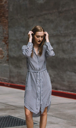 This vertical stripe print shirt dress is on-trend from Velvet by Graham and Spencer. You will be sure to make an entrance when you appear in this dress.  A great choice for day or night or even a special occasion. Details on this all time closet favorite include navy blue and white stripes, buttons all the way down, side pockets and a self-tie belt at the waist.  With its scoop hem, this dress will get you to and from and everywhere in-between. Fabric is 100% Viscose. Dry Clean. Made in USA.  Measures 40 1/2" bust, 1" below the armhole.  43 1/8" long, measured from the center back.