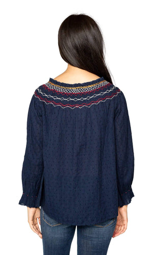 A stunning statement piece with vintage and bohemian style elements, the Trudie Embroidered Smocked Shirt by designer Velvet by Graham & Spencer is one of our latest arrivals.  The Trudie features a smocked neckline with a hook eye keyhole front closure and decorative ties with tassels.  The sleeves are gathered and accented with little red beads about two inches from the ruffle cuff.  The body of the top has a loose fit and a distinctive textured cotton.  Available in Navy.  Fabric is 100% Cotton.  Machine wash cold on delicate cycle, tumble dry low.  Made in India.