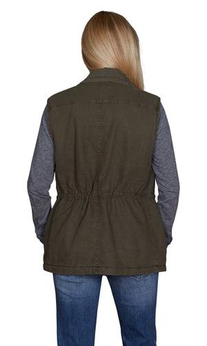 This versatile vest by Velvet by Graham and Spencer is both durable and attractive. The soft padded linen cotton adds warmth without hindering your movements. The anorak Waylin vest has lots of features. To start there are lots of pockets; two front flap pockets at the chest and slit pockets on each side. The Waylin has a zippered front closure as well as a drawstring at the neck and the waist. Offered in two great colors: Deep Green and Vintage Black. Fabric is 55% Linen, 45% Cotton / 100% Cotton. Measures 27 5/8" long, measured from the center back. Made in China. Machine wash, tumble dry low.