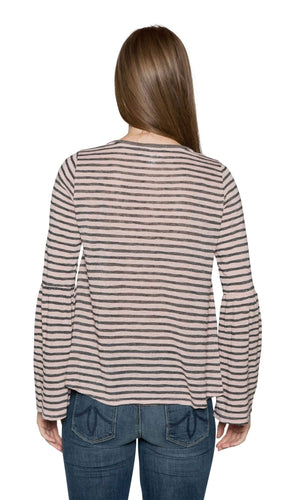 Velvet by Graham and Spencer has crafted the Zabrina, a bell sleeve top that creates a boho-chic vibe. The long bell sleeves flutter alongside this relaxed fit to keep this top looking fresh. One can easily update your wardrobe with this statement striped print. Stripes are always a timeless classic. The textured stripes enable you to pair this top with all your seasonal favorites. Available in Moon (off white) and Coquette (pink) each with grey stripes. Fabric is 62% Viscose, 38% Polyester. Machine Wash. Made in USA.