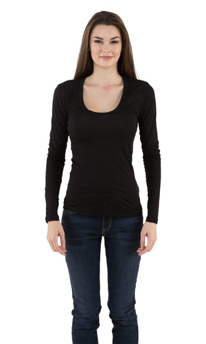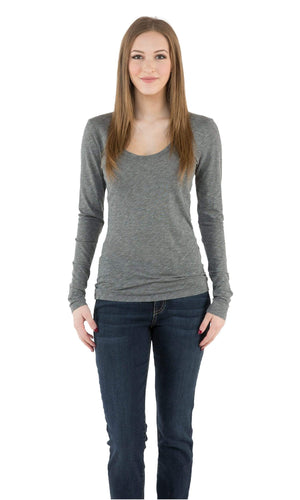 Here's your go-to tee for everyday comfort. Velvet by Graham and Spencer Zipporah Scoop Neck Tee has made this long sleeve tee an everyday essential. With its slim sleeves, this classic gauzy cotton is available in lots of colors: Black, White, Charcoal Grey, and Lavarock. A staple all year long. Machine wash, tumble dry low. Fabric is 93% Cotton, 7% Elastane. Measures 26 1/4" long, measured from the shoulder. Made in USA.