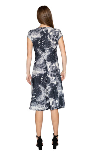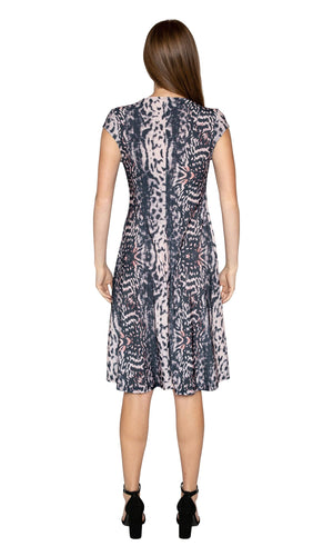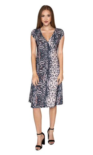 The Chilequile dress from Viereck is a lightweight and wrinkle-resistant dress that offers a flowing look in a lively prints. Â Â Available in Oscar (grey) and Beowolf (pink). Â Features a crossover front top and an A Line body style. Â The Chilequile dress also has a below the knee length. Â Fabric is 93% Microfiber, 7% Spandex. Â Hand wash cold. Hang dry. Â Made in USA.