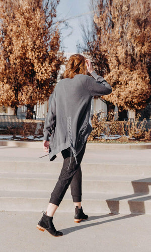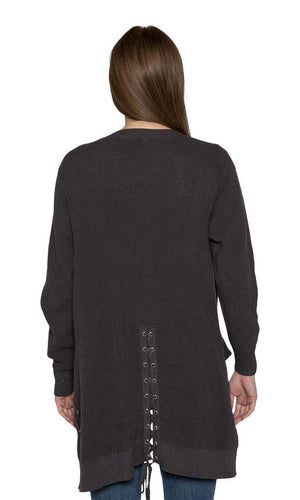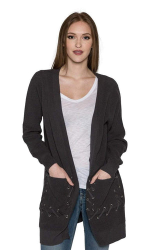 Keep warm in this waffle knit cardigan perfect for cooler weather.   You'll love its generous length and upscale quality!  Not to mention the extra details with its two front patch pockets that lace up with grommets and on the back side too.   The lace up design is fashion-forward on trend for an easy soft fit.  Sport this warm and cozy cardigan in slate color.  Fabric is 100% Cotton.  Hand wash cold.  Lay flat to dry.  Made in China.