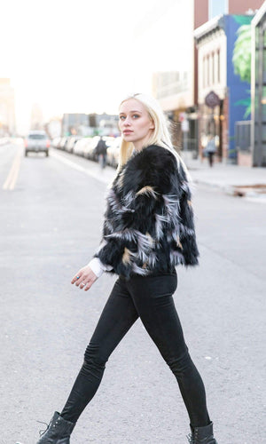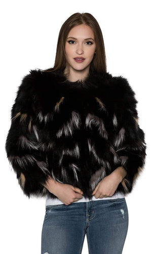 Love Token has designed an eye catching gorgeous genuine fur coat that won't leave you out in the cold. The Melanie jacket is composed of lux fox fur highlighted with geometric accents in multi contrasting colors.   This luxurious jacket comes complete with long sleeves and has 4 concealed hook-and-eye closures in front.  This incredibly chic fur coat will keep you warm and have you looking like stunning and truly one of a kind.   Available in Black Multi.   Fabrication is 100% Fox Fur; Lining: 100% Polyester.  Professional Fur dry clean. Made in China. Model is 5'9" and wearing a size Small.  Runs true to Love Token standard sizing.