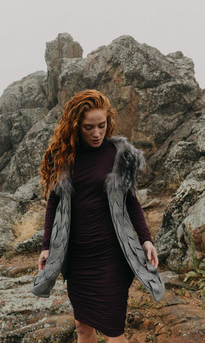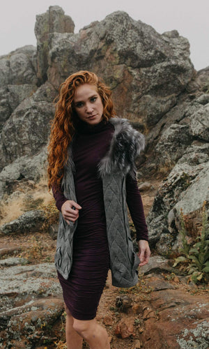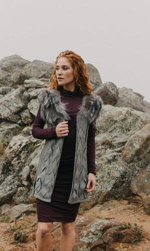 Love Token's Melody Vest features a fur trim collar annd a knit cardigan body. It has been crafted with a beautiful braided knit construction on the front of the vest. Then Love Token has accentuated it with an elegant fox fur around the collar. This open front, sleeveless vest is a great layering piece and a true statement cardigan. Trim is 100% Fox Fur. Yarn content is 70% Acrylic, 30% wool. Dry Clean. Imported: China