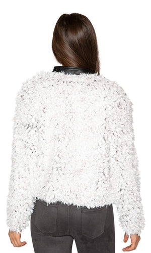 Stay on trend with this cute cropped faux fur jacket by designer Love Token. Â This jacket features a smoke grey faux fur that is incredibly soft. Â The front has a zipper closure adorned with faux leather trim including the collar. Â The interior is lined and the jacket does have a cropped length that hits above the hips. Â Love Token's faux fur fabrication is always quality so much so that the faux fur really does look like real fur. Â Available in Smoke (light grey faux fur with black faux leather trim). Â The light grey color looks like a dirty white. Â Model is 5'9" and wearing a size Small. Â Fit is true to Love Token standard sizing. Â Faux fur is 100% Polyester. Â Lining is 100% Polyester. Â Trim is 100% Polyurethane. Â Professionally Dry Clean only. Â Made in China.Â
