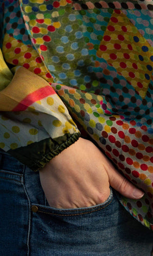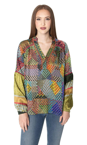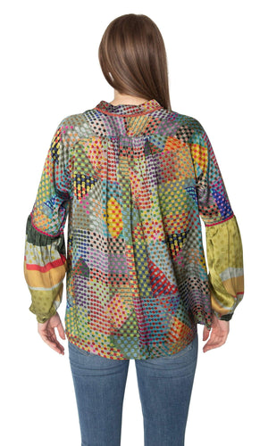 Set yourself apart in this distinctive statement blouse by designer Conditions Apply. Â The Rise Above All blouse features a henley style neckline with a v neck. Â There is also a contrasting lace trim around the neckline. Â The body of the top showcases a modern multi-color pattern with contrasting dots. Â The sleeves are long sleeve and gathered at the cuff. Â They also flare to a bell style at the elbow with a contrasting pattern from the elbow to cuff which is offset by trim detail. Â Available in an Olive multi-color polka dot pattern. Â Model is 5'9" and wearing a size Small. Â Â Fabric is 100% Viscose. Â Trim / decoration is 100% Cotton. Â Made in India. Â Professional dry clean only.